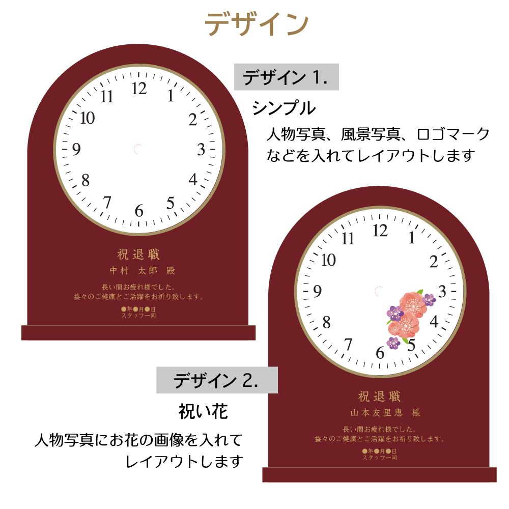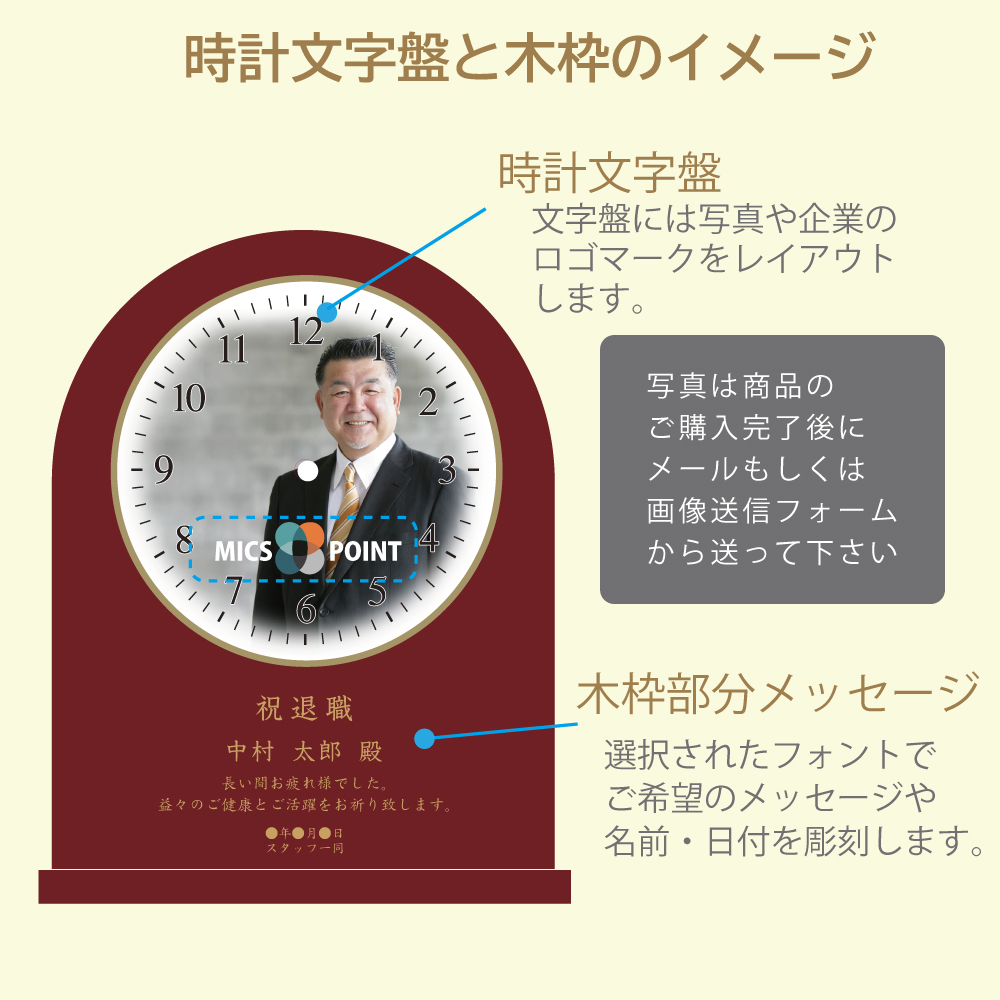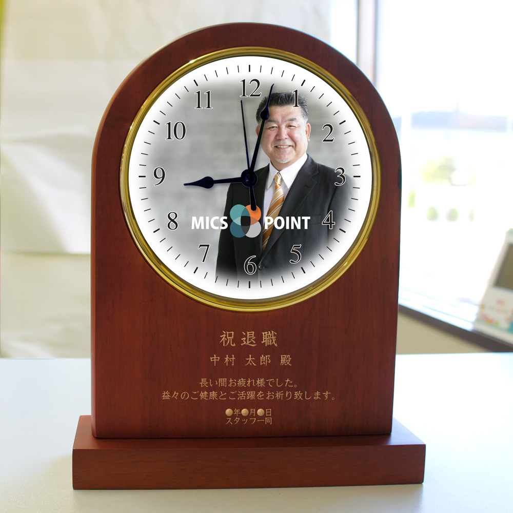 アーチ型の木製置き時計。時計文字盤には対象者の写真や企業ロゴ等をレイアウトすることが出来ます。木枠には感謝の文面を彫刻します。文面は自由な内容でご用意ください。