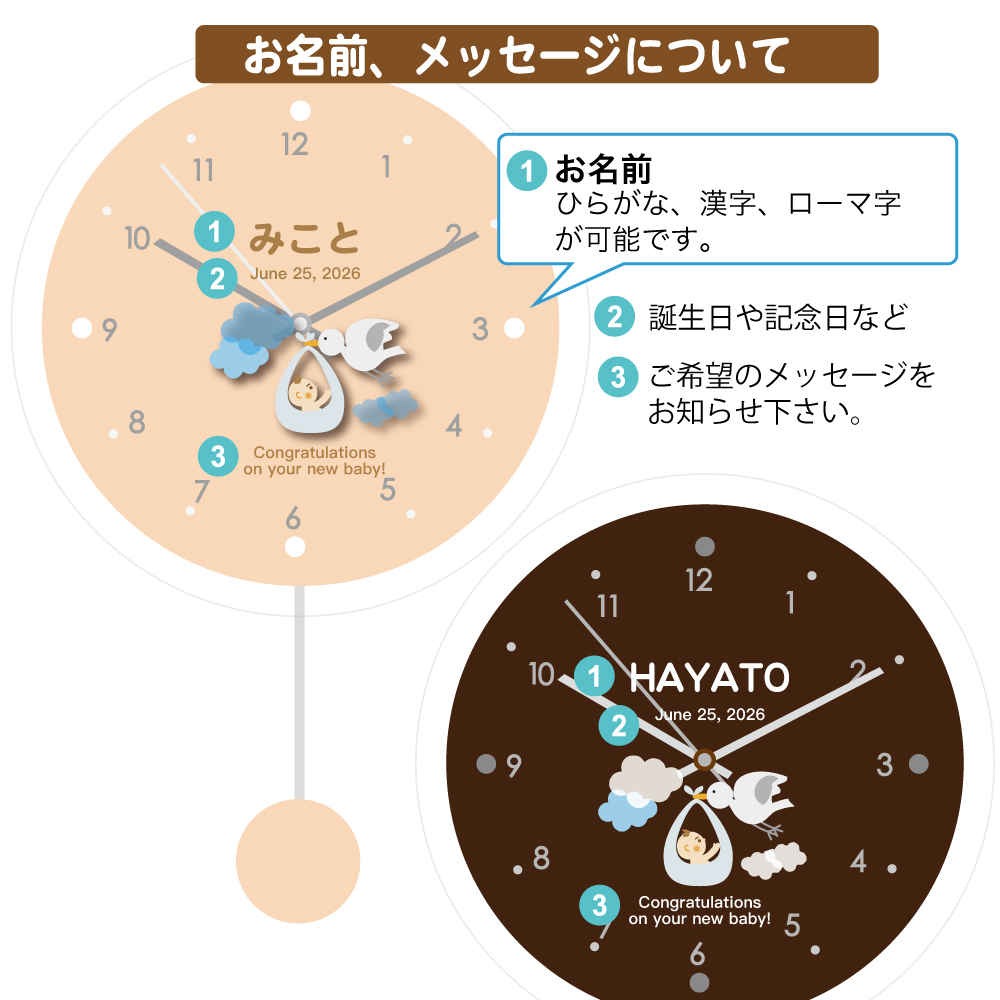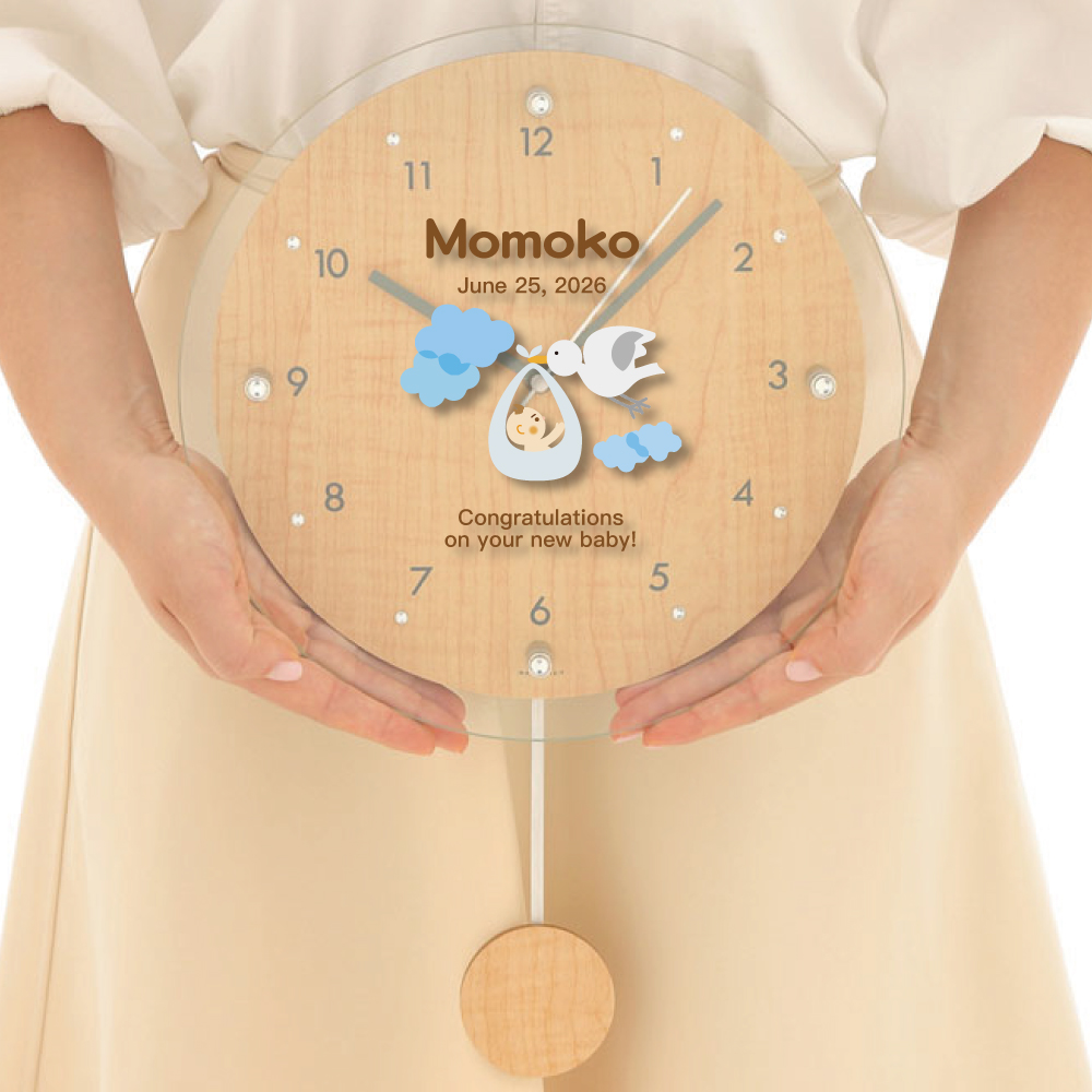 カラフル振り子時計(電波時計)「コウノトリ」 出産祝いにお子様のお名前やメッセージを入れて