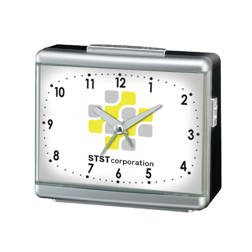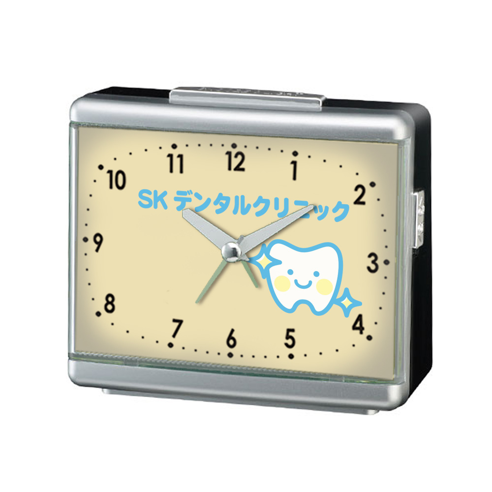 スムーズに動く音の静かな連続秒針。電子音アラーム付きの四角い形の目覚まし時計。丸型に比べるとスペースがあるので写真全体が入ります。