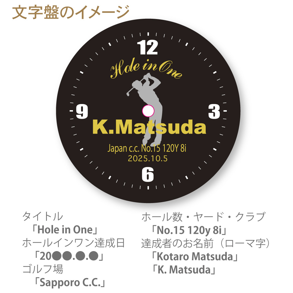 ゴルフをしていて一生に一度あるかないかのホールインワンを達成してしまった!そんな喜びの記念品として、名入れ、記念日、記録を印字したオリジナル文字盤の時計を作ります。