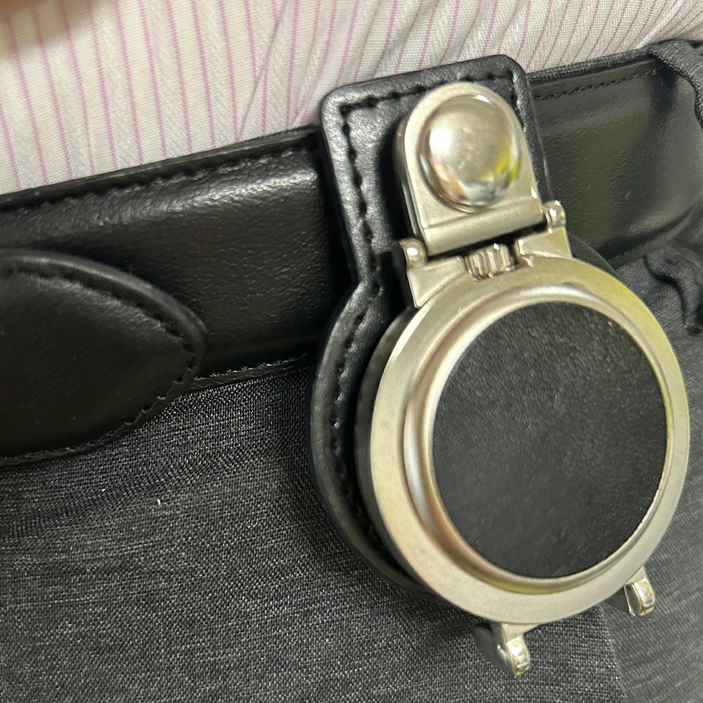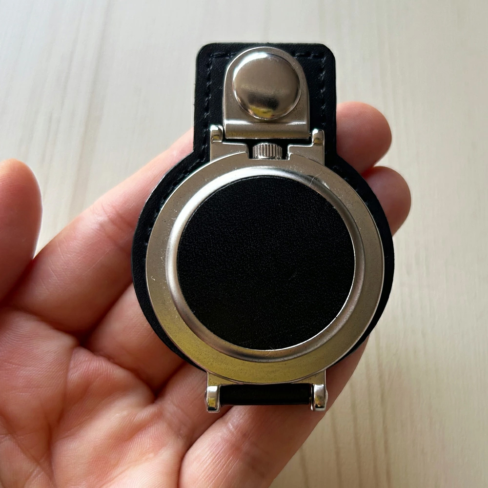 コンパクトなスタンド式の時計です。折り方を変えるとベルトに通すことも出来る2WAYタイプ。